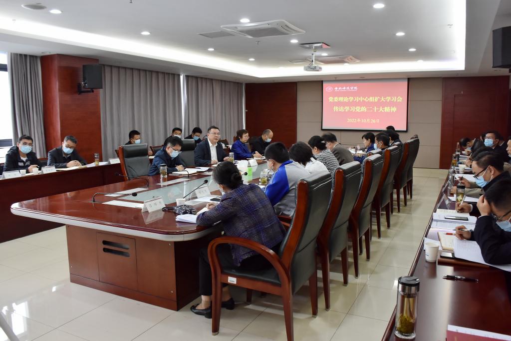 本网讯 10月26日上午,学院举行党委理论学习中心组扩大学习会,传达学习党的二十大精神并就如何抓好学习宣传贯彻工作部署安排。党委书记徐成钢主持会议并讲话。党委理论学习中心组成员出席会议,党委理论学习中心组成员,各院系级党委(党总支、直属党支部)书记,各学院院长,各部门主要负责人参会。