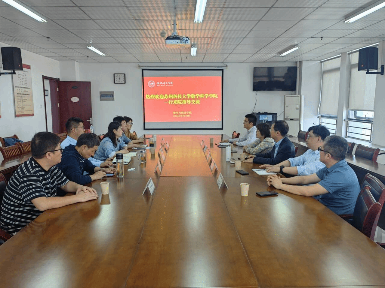 座谈会上,党委书记穆娟对苏州科技大学数学科学学院一行的到来表示热烈欢迎,并简要介绍了学院基本情况。副院长黄浩从学院发展历史沿革、师资力量、学科专业建设特色、教学科研成果、质量文化建设等方面介绍了数学与统计学院的整体情况。与会双方就学科建设、专业建设、人才培养、学科竞赛、产教融合、研究生培养、硕士点建设等方面进行了广泛而深入地交流与探讨,分享了各自的经验和做法。